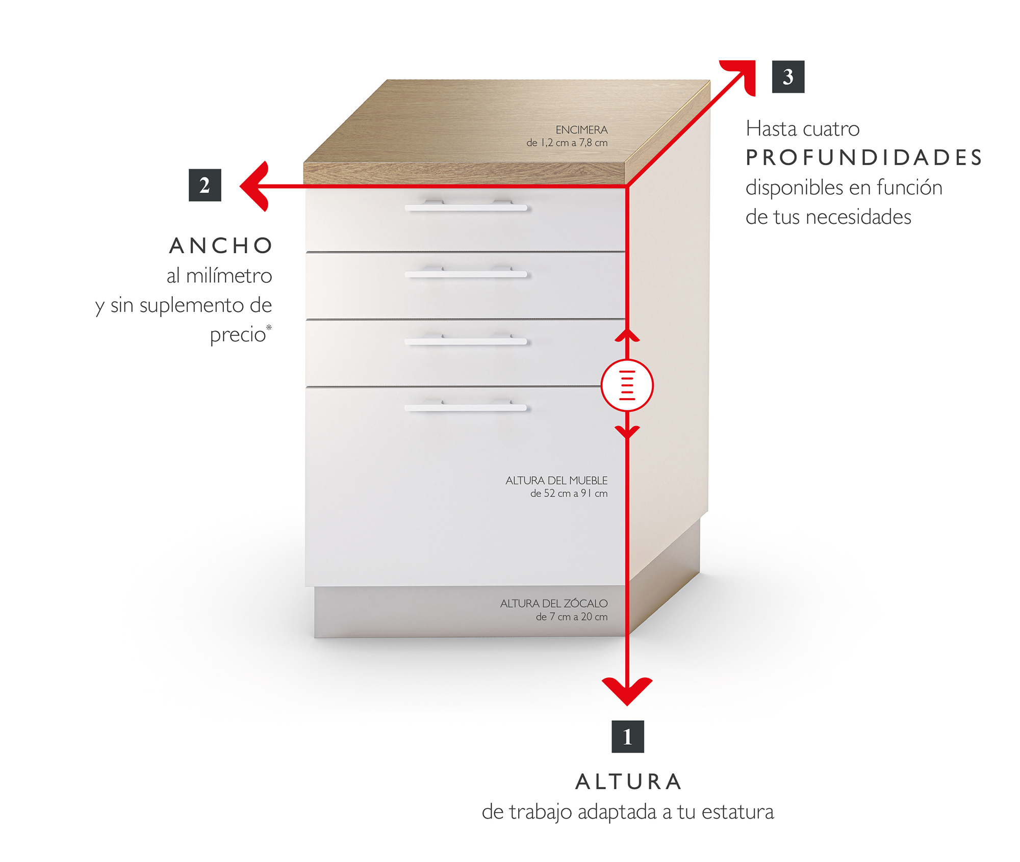 *Hasta tres muebles a medida sin coste adicional que podrás escoger entre una colección de muebles a medida, a excepción de los acabados Sign y Twin, las gamas Lagune, Glamour, Fresh, Portland, Crystal, y las gamas de madera y MDF con marco.