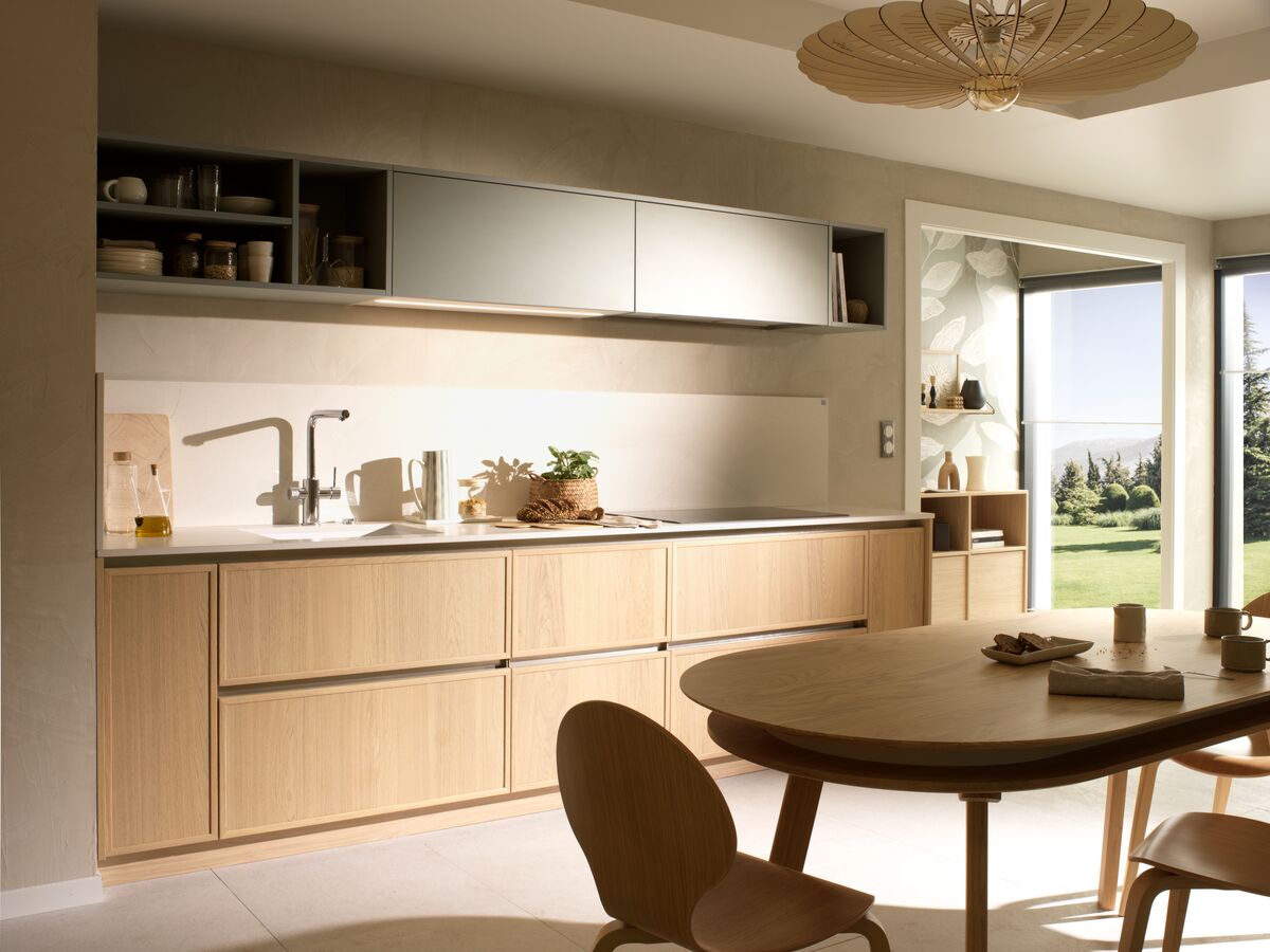En sus nuevas gamas «Baia» y «Dolce Bosca», Schmidt ofrece con naturalidad toda una variedad de tonos claros y oscuros, reflejo de la vida arbórea. Los paneles están compuestos de aglomerado con chapa de roble. Por su parte, la madera utilizada para fabricar los frentes procede de bosques gestionados de manera sostenible.