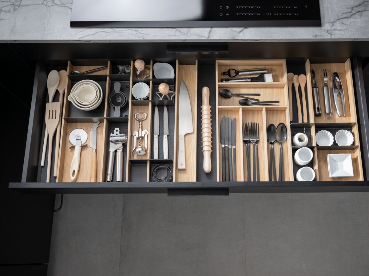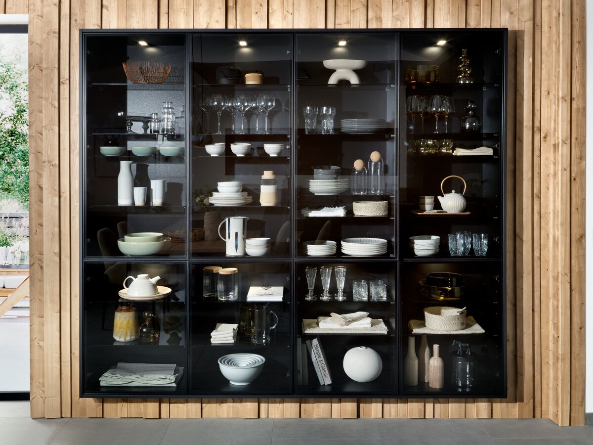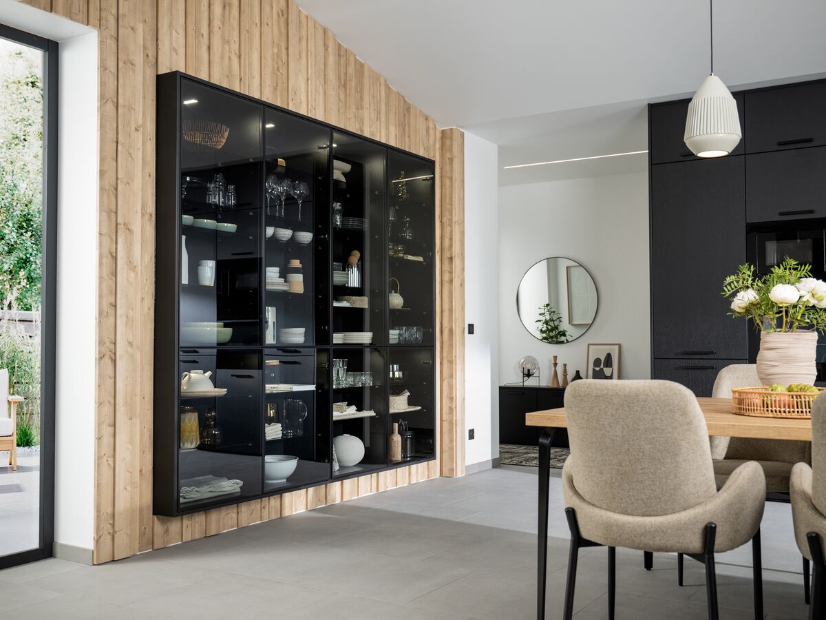 L'espace est soigné, sans artifices, minimalistes. Les meubles vitrés, à la fois esthétiques et fonctionnels, permettent de ranger sans dissimuler. Une solution moderne qui associe esprit pratique, élégance épurée et tendance naturelle.