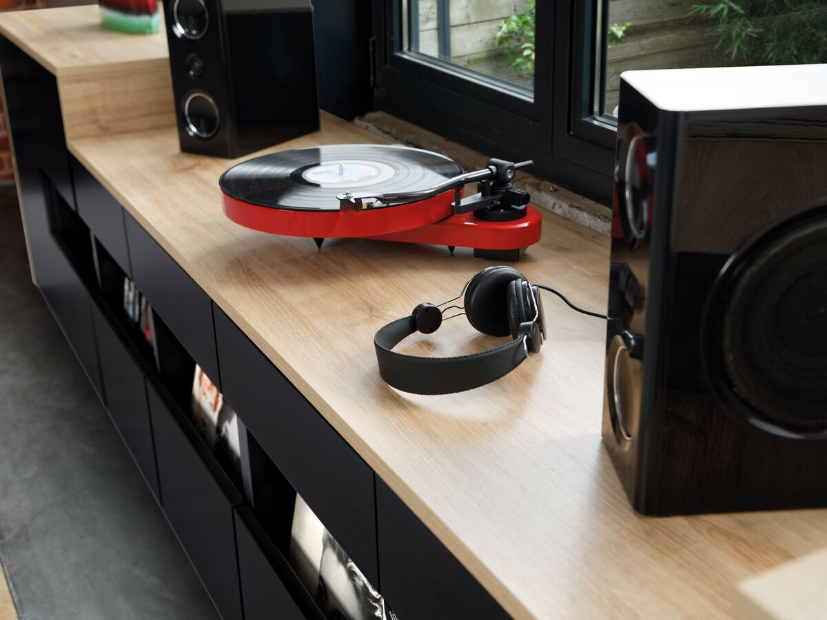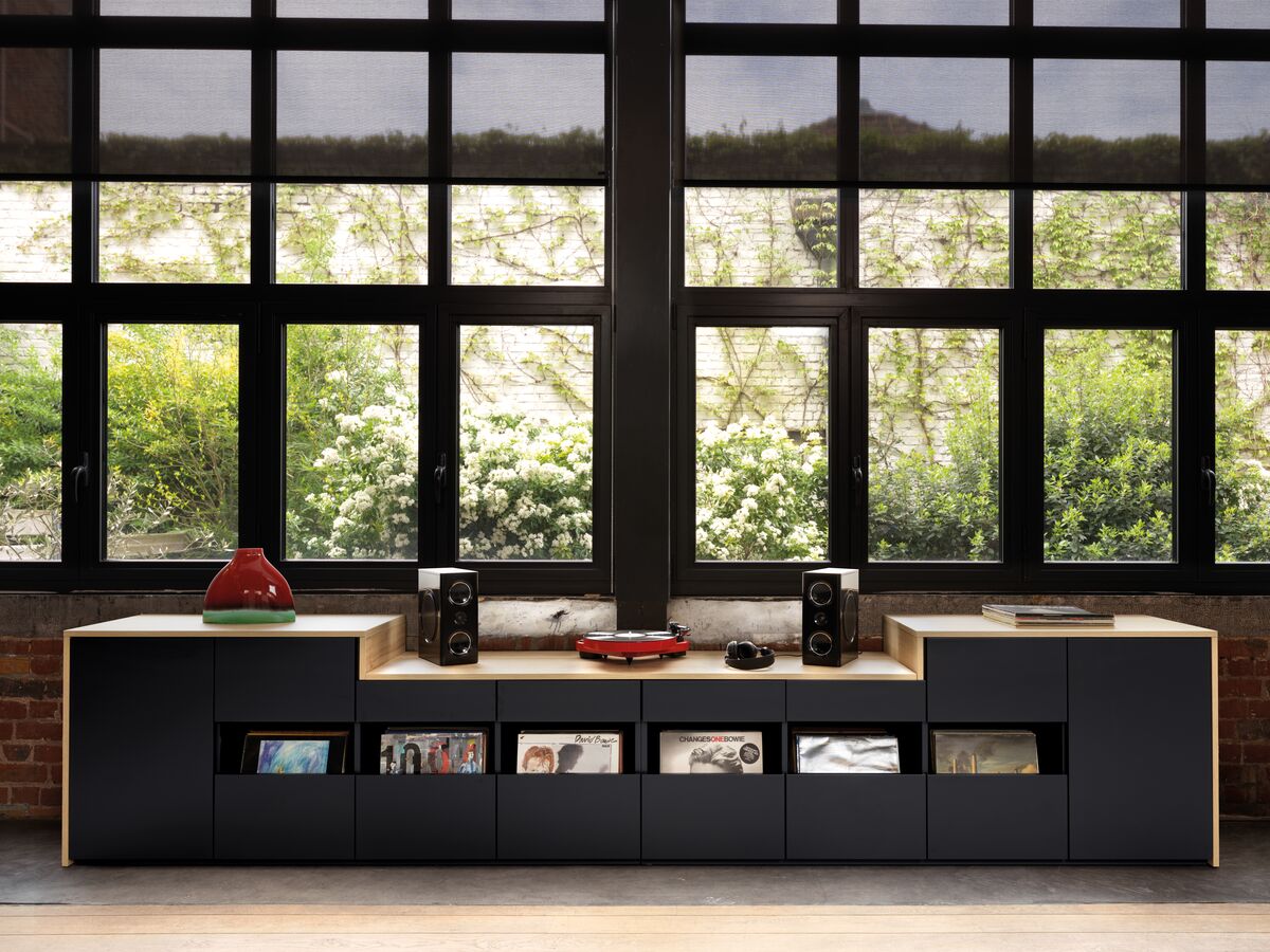 Meuble bas idéal pour les mélomanes et collectionneurs de disques.
