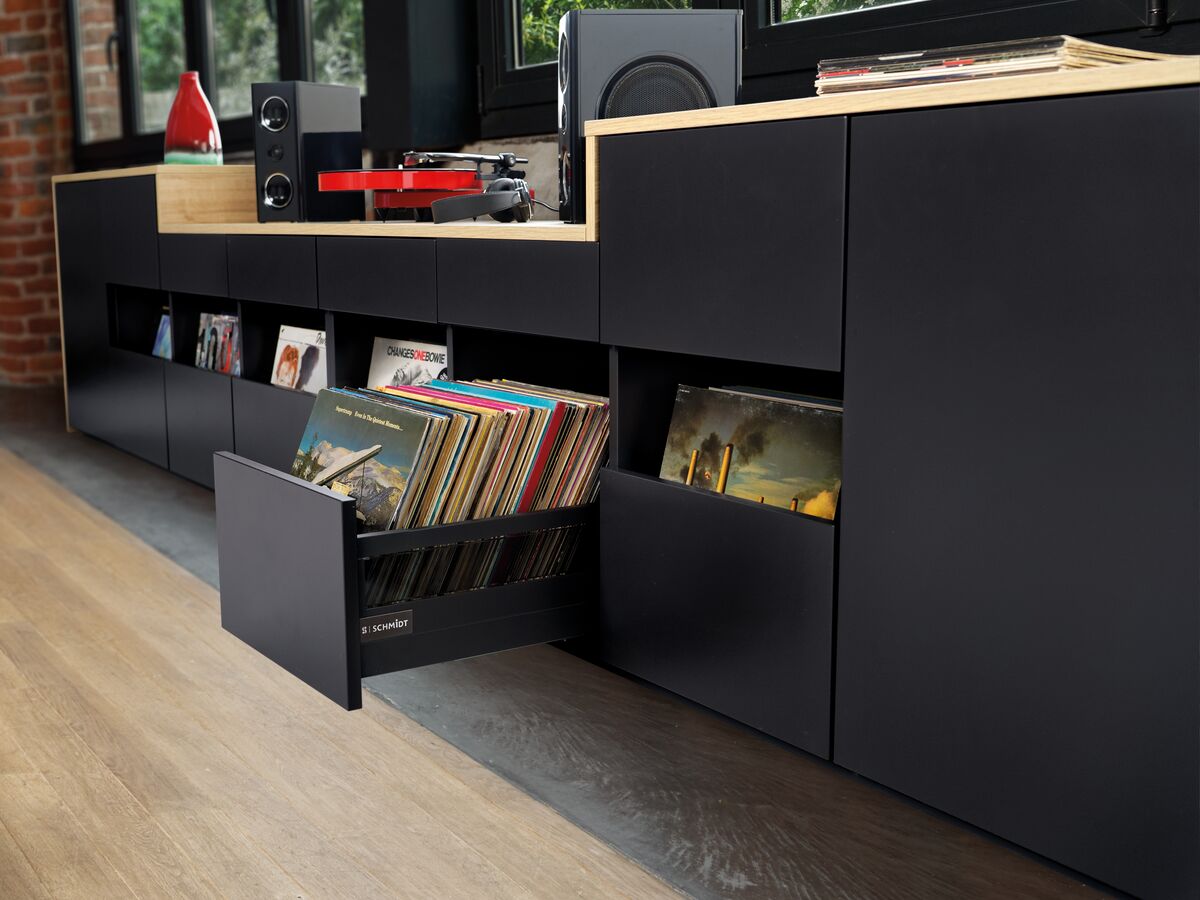 Ce meuble platine vinyle sur mesure allie design et praticité pour les passionnés de musique. Bas et parfaitement ajusté, il met en valeur une collection de disques tout en offrant des rangements astucieux. Les tiroirs coulissants permettent de repérer facilement les pochettes, sans même avoir besoin de les ouvrir complètement. Un meuble élégant et fonctionnel, pensé pour sublimer l’univers vinyle.