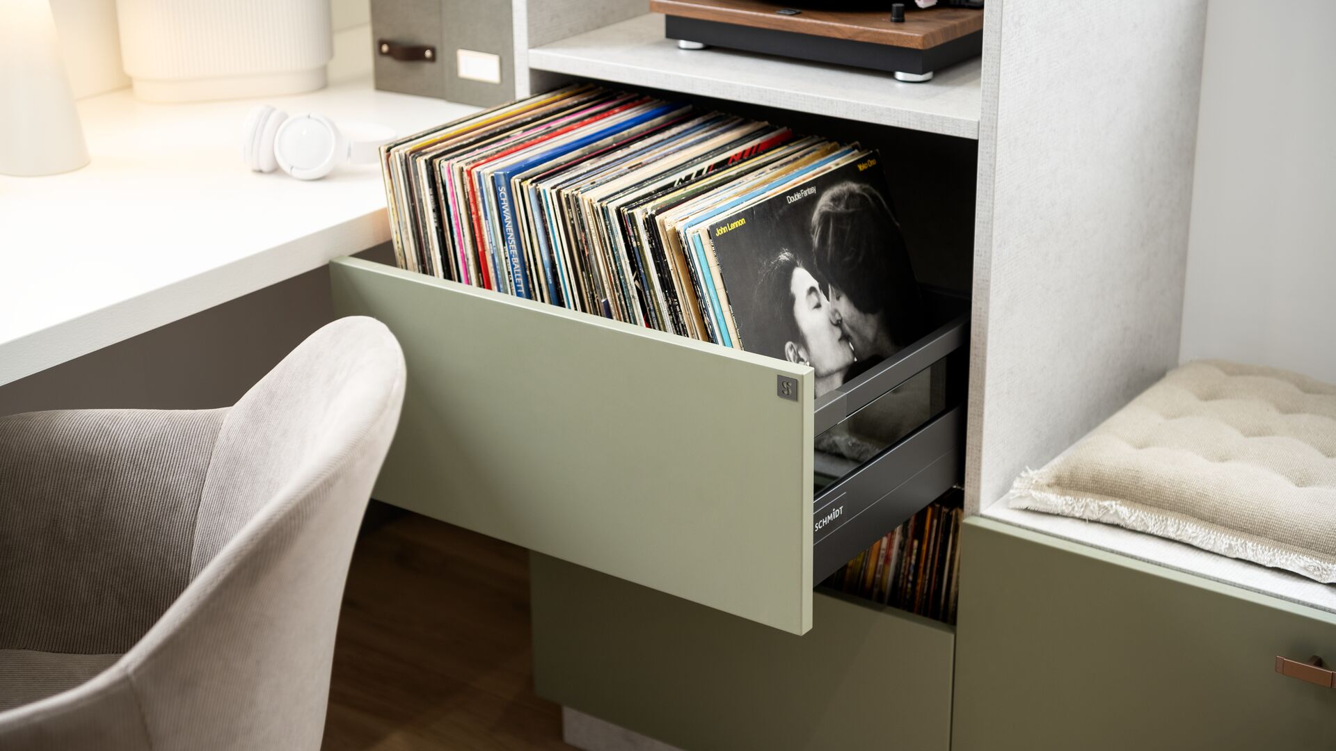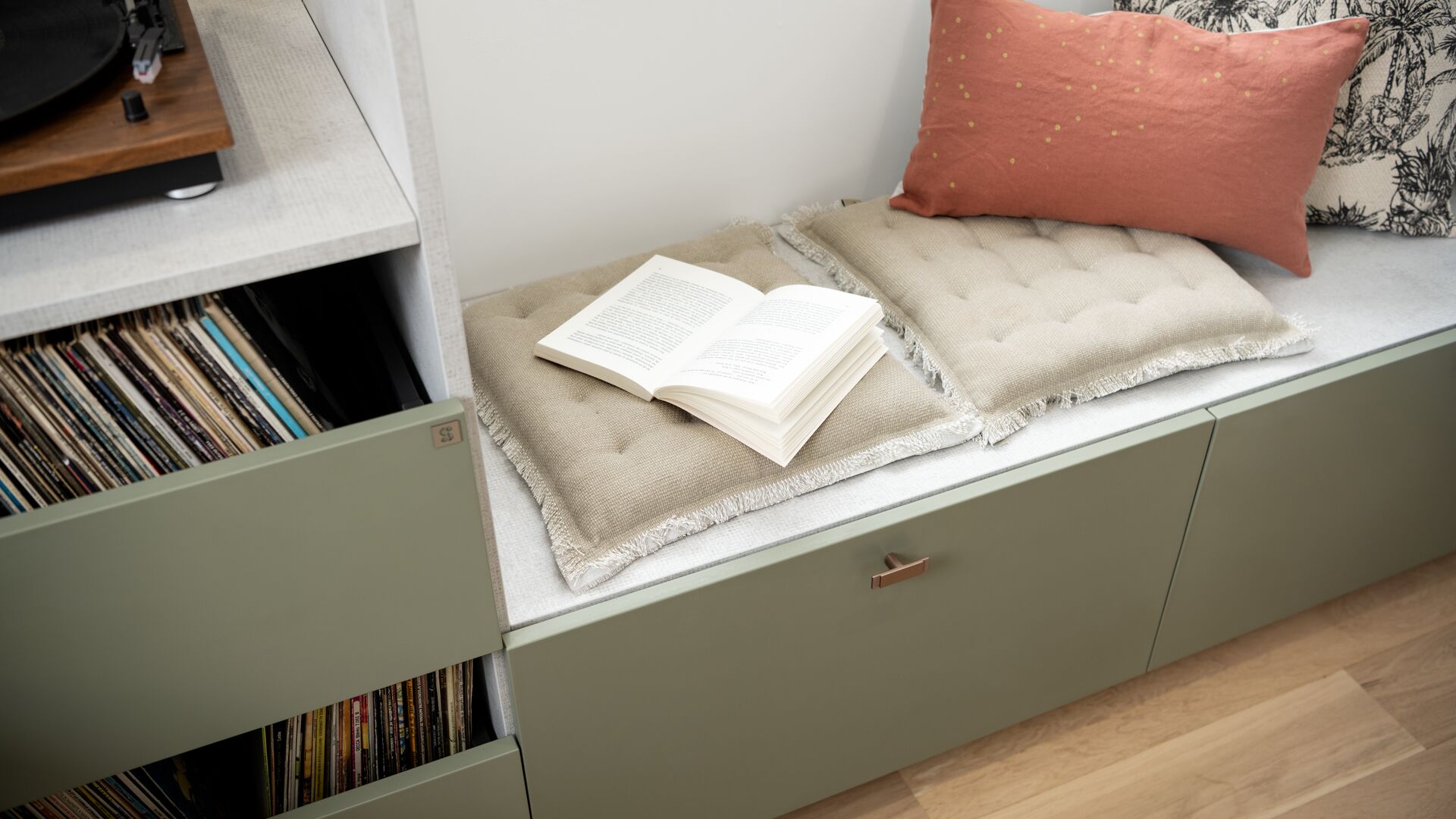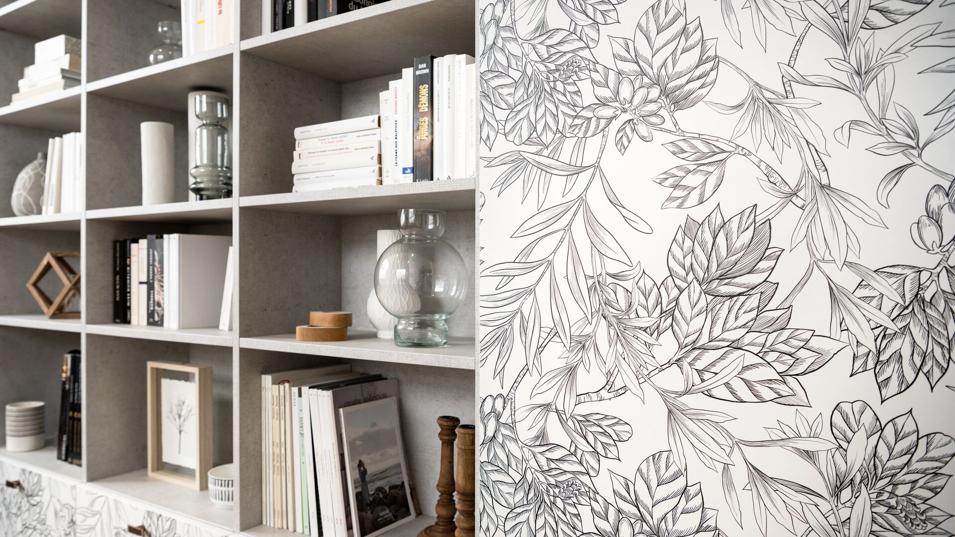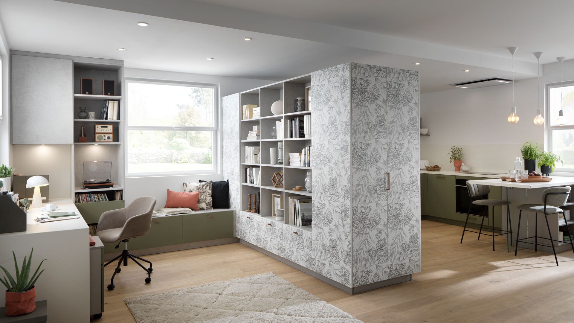 Bij het inrichten van hun interieur wilde het stel veertigers een ruimte creëren met een bureau en boekenkast, gescheiden van de keuken en woonkamer. De collectie “Botanic Print” viel bij hen bijzonder in de smaak vanwege de modulariteit en de mogelijkheid om een wand te creëren. De boekenkast met open gedeeltes bakent de verschillende leefruimtes goed af. Daarbij beschikt meneer over voldoende ruimte om zijn boeken op te bergen en is er plek om verhalen voor te lezen aan zijn zoontje waarbij plaats kan worden genomen op de bank. De werkhoek moest designvol en functioneel zijn. Met het meubel met wieltjes en de goed uitgedachte verlichting is de opdracht absoluut geslaagd!