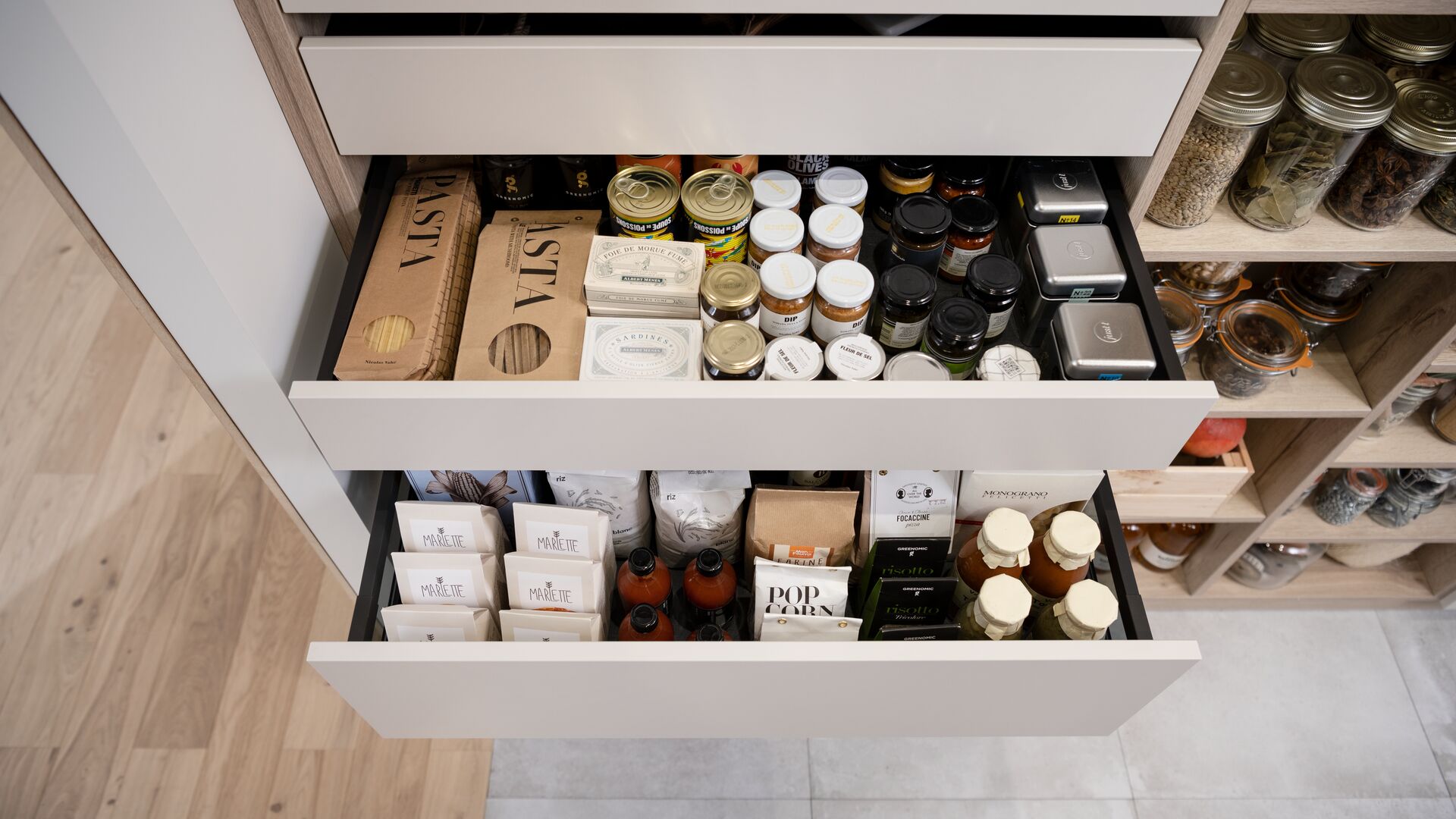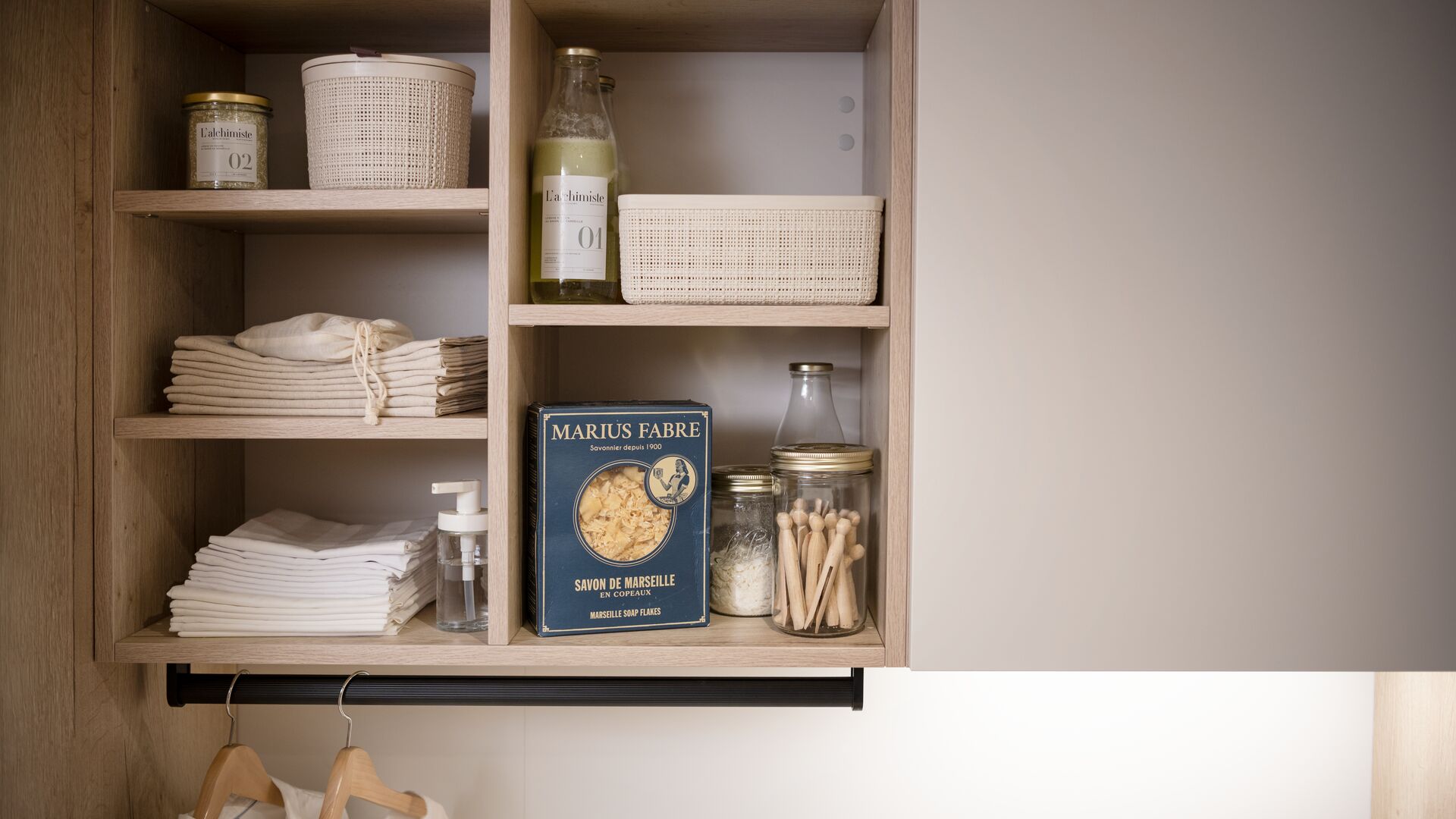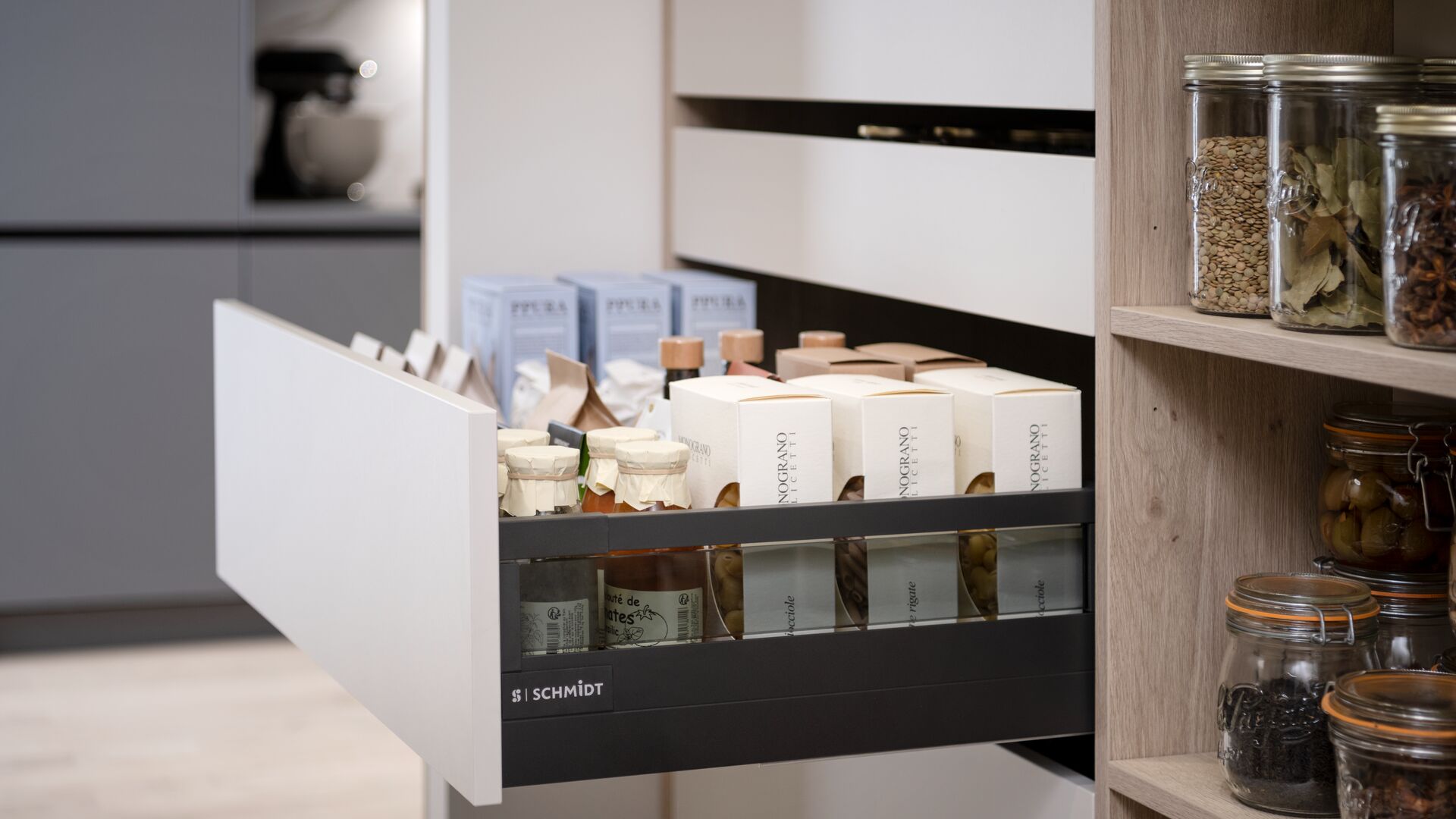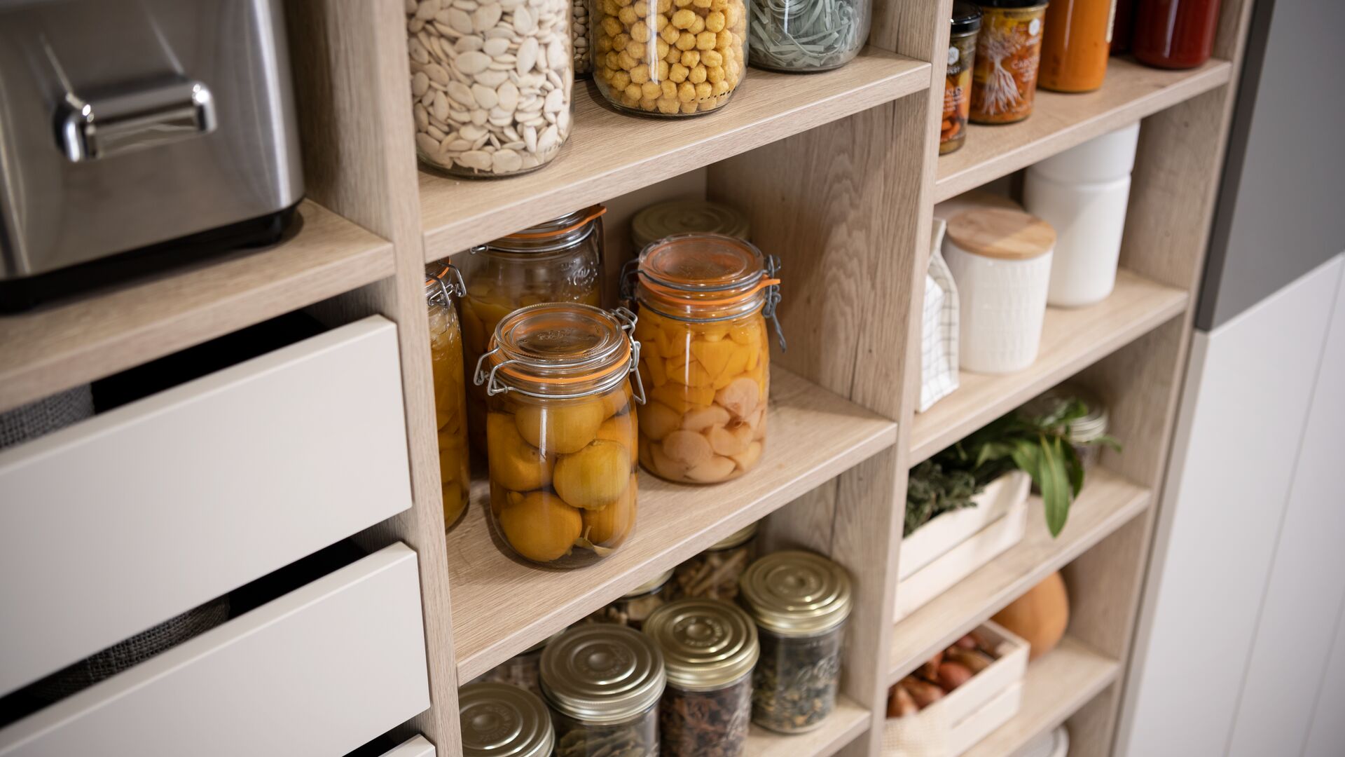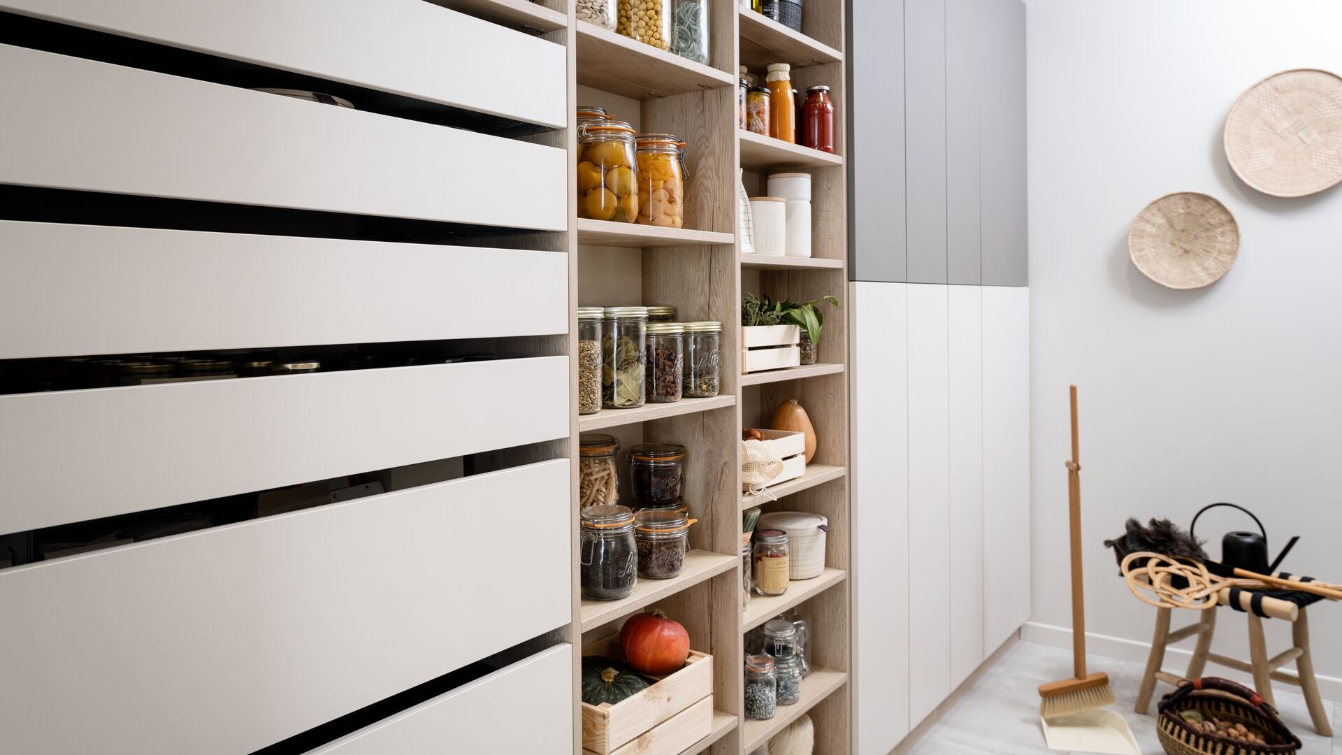 "Alles op zijn plaats"... Zo willen Oscar en Anne dat hun bijkeuken ingericht wordt! Praktisch opruimen staat centraal bij dit stel, dat boven alles de voorkeur geeft aan een eenvoudige en slimme inrichting die aangepast is aan hun dagelijks leven. Aan een kant elementen om ervoor te zorgen dat de bijkeuken functioneel is en aan de andere kant meubels om alle voorraden prefect op te ruimen. Deze inrichting zorgde er trouwens voor dat het stel gekozen heeft voor dit design van Schmidt. Zachte kleuren, hoogwaardig materiaal, strakke lijnen en efficiënte opbergruimte... het recept voor een prefect uitgedachte inrichting volgens Oscar en Anne!
