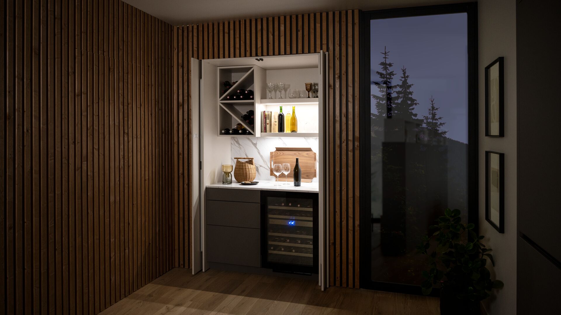 Iedere keer wanneer Oscar en Anne vrienden ontvangen, krijgen ze dezelfde reacties bij het openen van de deuren van hun "winestation": WOW! Dit verborgen keukenmeubel is perfect weggewerkt achter elegante met hout bedekte deurtjes en zorgt ervoor dat het stel zich weer even kind voelt! Achter de deurtjes bevindt zich echter een volledig uitgeruste wijnkast: verlichte planken voor de glazen, kruisverdeling voor de flessen, een gekoelde wijnvitrine...! Een onzichtbare en eenvoudig toegankelijke ruimte voor gezellige en ontspannen momenten met vrienden of familie… Ze waren direct verkocht!